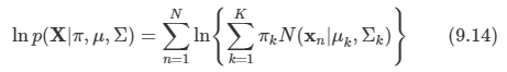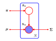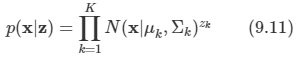 - x의 주변 분포는 식 9.7 형태의 가우시안 혼합 분포가 된다. 여러 개의 값 x1, ... xN을 관측했을 경우, 주변 분포를 p(x)의 형태로 표현했기 때문에 모든 관측된 데이터 포인트 xn에 대해서 해당 잠재 변수 zn이 존재한다.