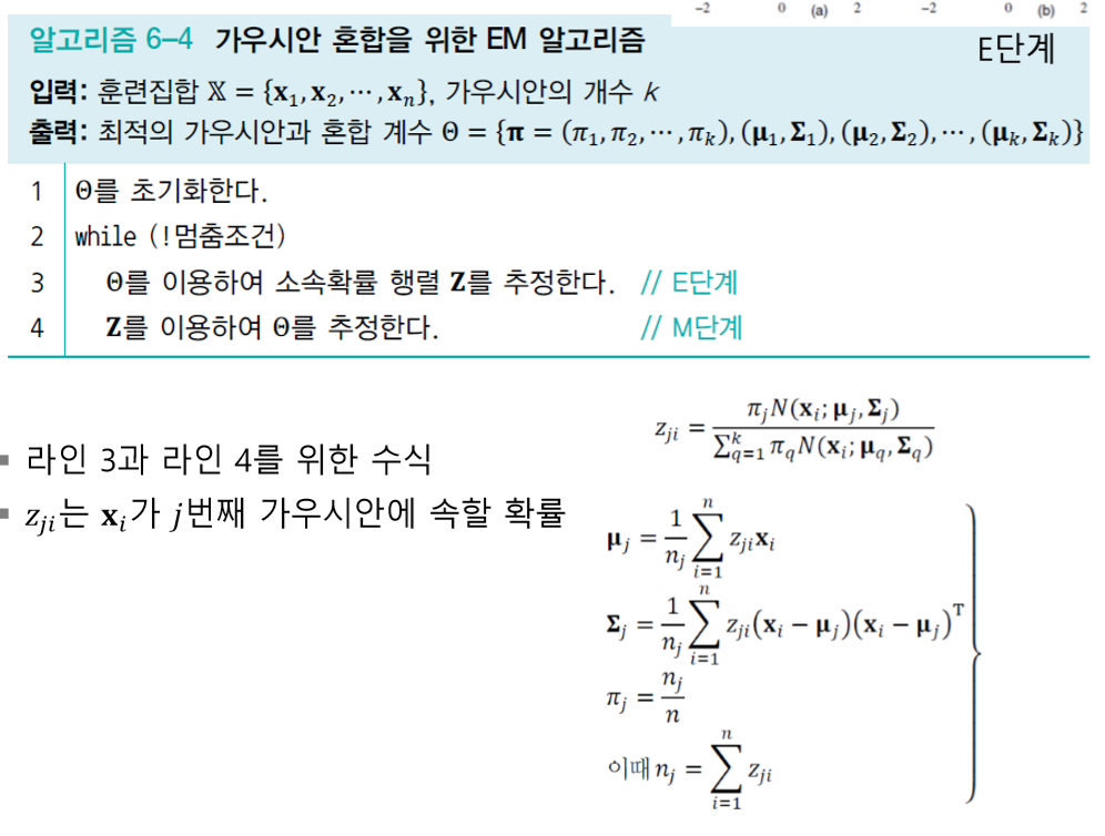 - 각각의 두 단계를 E(expectation, 기댓값) 단계와 M(maximization, 최대화) 단계로 이를 합쳐 EM 알고리즘이라고 부른다.