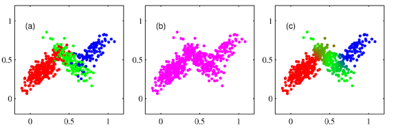 결합 분포로부터의 표본들은 (a)에 해당한다. 여기서 x 값에 해당하는 포인트들을 그리고 이에 대한 해당 z 값에 따라 그 포인트를 색칠(빨강, 초록, 파랑)하는 방식을 사용했다.