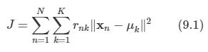 - 각각의 데이터 포인트로부터 가장 가까운 μk까지 거리의 제곱합들이 최소가 되도록 하는 것이 목표다.