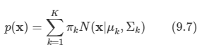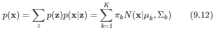 가우시안 혼합 분포를 다음과 같이 선형 중첩 형태로 적을 수 있다.