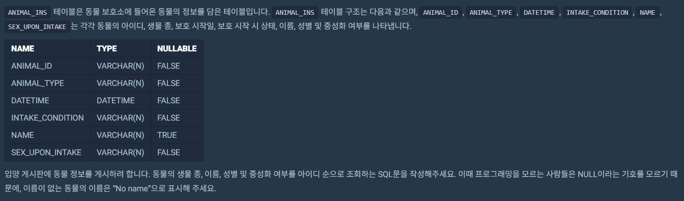 SELECT ANIMAL_TYPE,ifnull(NAME,"No name") AS 'NAME',SEX_UPON_INTAKE FROM ANIMAL_INS;