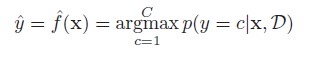 주어진 입력 벡터 x와 훈련 집합 D에 대해 가능한 레이블들의 확률 분포를 나타낸다. 일반적으로 이 것은 길이가 C로 나타난다. 훈련 집합 D 뿐만 아니라 테스트 입력 x에 대한 조건부 확률이라는 것을 명시적으로 나타내기 위해 표기법에서 조건식 기호 | 의 오른쪽에 D와 x를 둔다.